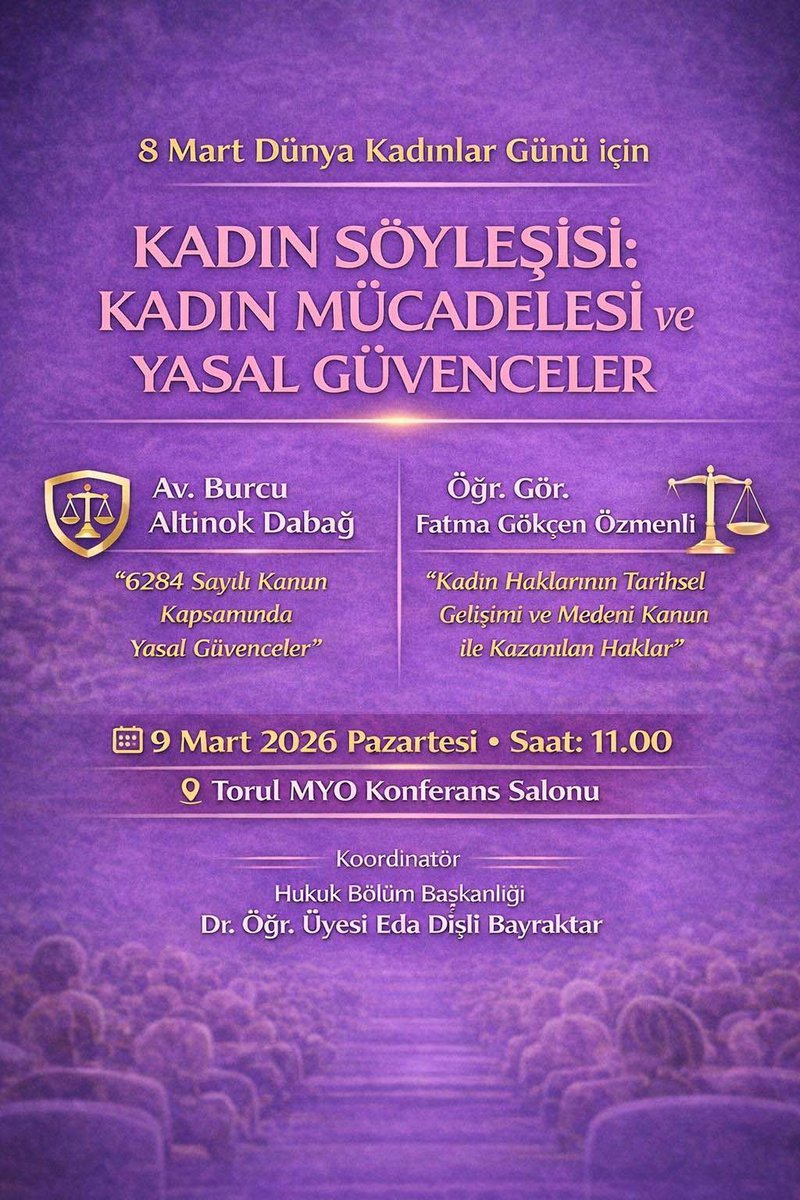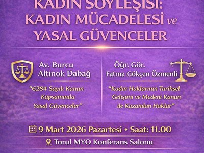 8 Mart Dünya Kadınlar Günü kapsamında, Torul Meslek Yüksekokulu Hukuk Bölüm Başkanlığı koordinasyonunda “Kadın Söyleşisi: Kadın Mücadelesi ve Yasal Güvenceler” başlıklı bir etkinlik düzenlenecektir.Söyleşide Av. Burcu Altınok Dabağ ve Öğr. Gör. Fatma Gökçen Özmenli konuşmacı olarak yer alacaktır. Tüm öğrencilerimiz ile akademik ve idari personelimiz davetlidir.
